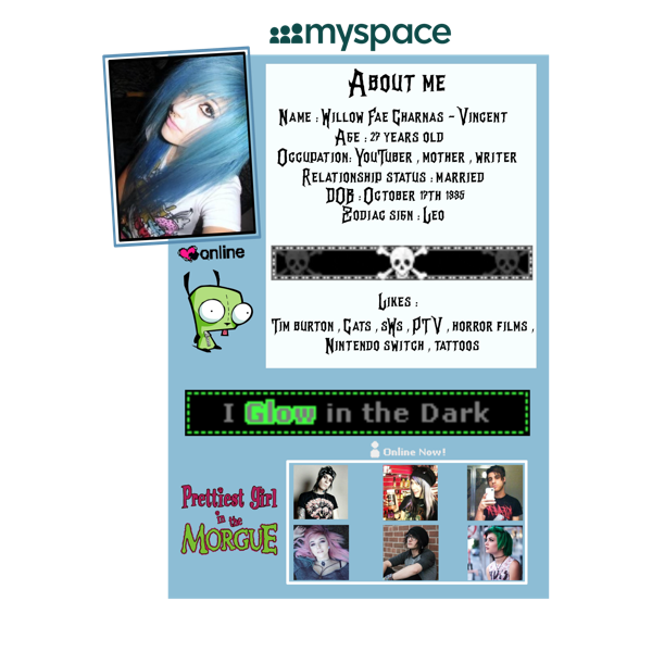 Willow Fae Charnas , Was Born October 17th 1995 in Los Angeles CA. Always having the most supportive family someone could ask for. She had always seemed to be the one who stood out the most in and out of school. Her style always being the most bright and Vibrant. And creating content and sharing her Journeys with others has always helped her reach her future dream of being a content creator.Having an older brother named, Spencer , willow has always seen herself wanting to resemble him in many ways. But she had always seen herself wanting to express her own style in various different colors and clothing styles. Always seeing her self into the dark kind of entertainment.Since the age of sixteen her YouTube channel has grown , and she has made friends and family with the mass amount of following that she has. She thanks them every day for everything they have done for her. From being supportive and being like second family she never had.Always wanting to settle down and start a family of her own , she knew it would be very easy but also hard at the same time. Down the road she found who she thought was the one and has her first beautiful baby girl that she names Zelda Wren , a year later she welcomed. Beautiful baby boy that she named Salem Layne.After that and some trouble and heartbreak , she found her true love. When they started off best friends in the beginning. And they developed into being more than that and are excepting their second baby together.